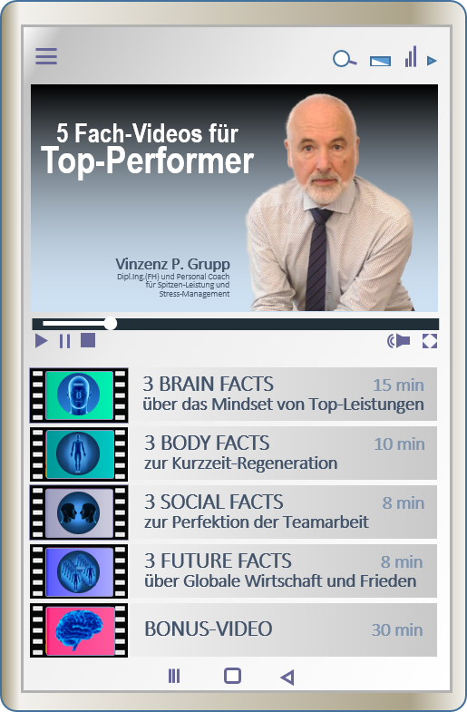 Weder Alter, noch Ausbildung, noch Berufserfahrung sind bedeutsam für Ihr Leistungsniveau. Neue Gehirnforschung zeigt: viel wichtiger ist, was die Neuro-Plastizität Ihres Gehirns stimuliert. Tägliche Kurzzeit-Regeneration mit einer völlig mühelosen Technik erzielt dabei schon in wenigen Tagen beste Ergebnisse.